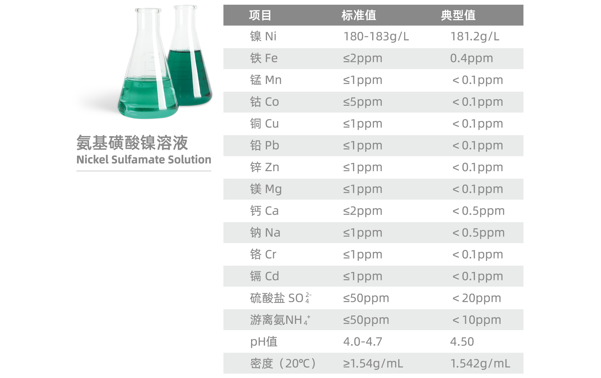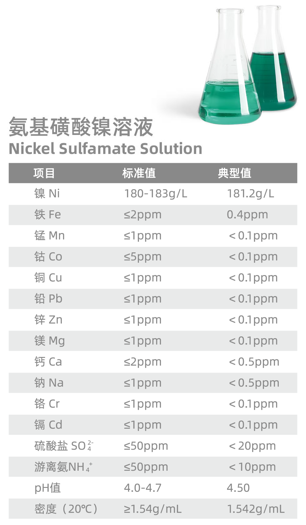 氨基磺酸鎳溶液(Nickel Sulfamate Solution) 分 子式:Ni(NH2SO3)2 分子量:250.87 性 狀:深綠色透明液體。 用 途:主要用于精密電鍍、電鑄、電子工業(yè)等。 包 裝:HDPE桶裝,每桶30公斤。 儲(chǔ) 運(yùn):運(yùn)輸時(shí)包裝要密封,運(yùn)輸過(guò)程中防止受熱,貯存在陰涼,通風(fēng)處。